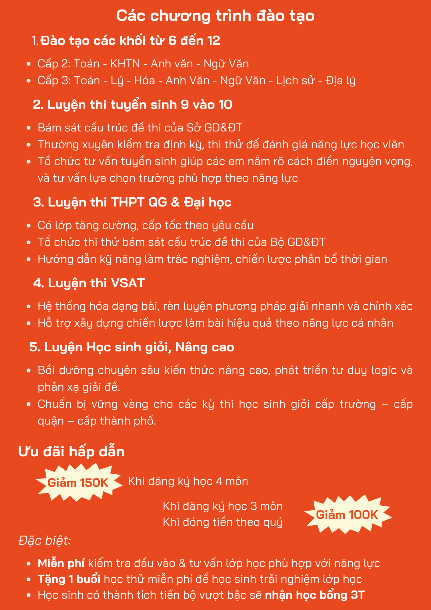 Chúng tôi tự hào sở hữu đội ngũ giảng viên giàu kinh nghiệm, tận tâm và luôn sẵn sàng hỗ trợ học sinh đạt được kết quả tốt nhất trong học tập.